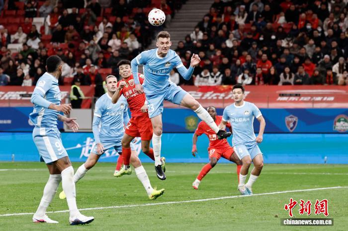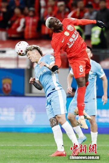 3月7日,两边球员正在角逐中争球。当日,2026赛季中原脚球超等联赛第1轮角逐中,上海海港队(白衣)主场1比2没有敌河北脚球俱乐军队。 中新社记者 殷坐勤 摄
